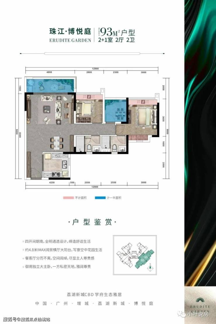 建筑面积约93㎡的2+1灵动实用户型,科学空间布局,四开间向南,竖厅餐客厅连厅设计,动静分区明确,方正实用。该户型是75㎡户型的扩大版,户型整体不计入产证面积近9㎡,含这些整体使用率高达92%