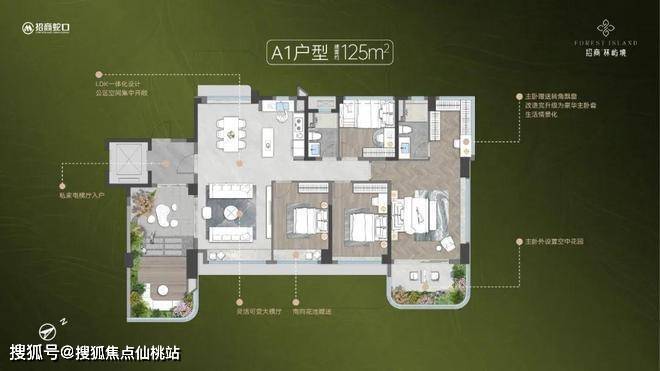 空中花园,创想无限:双南向空中花园设计,南露台约28㎡,主卧专享露台约15㎡,主卧露台+厅出露台,空中墅级奢享,多重观景视角,揽境入怀。