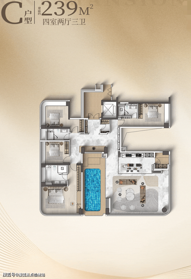最热门的建面约239㎡户型:以“空中平墅”为理念,配备独立电梯厅、入户花园、270°环幕采光,每户更配备了私人泳池。
