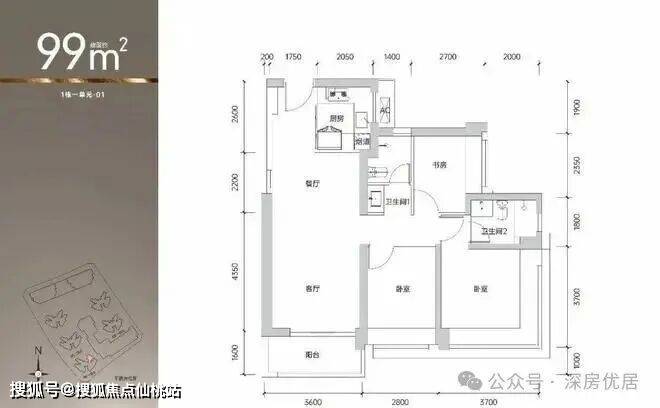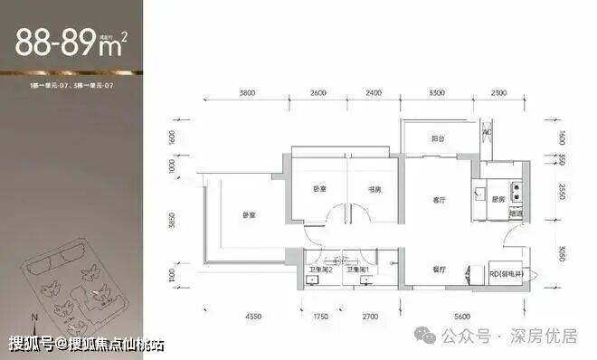 鸿荣源观城王炸户型 约89㎡3+1房2厅2卫