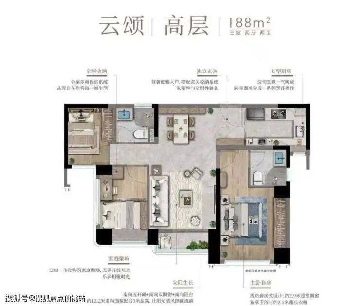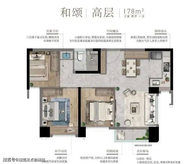 对,就是字面意思。虽然只有一个卫生间,但确保了客餐厅、房间的基本功能和88㎡基本一致,而且卫生间做了干湿分离,三口之家的使用也基本足够。