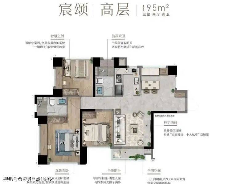 95㎡就是三房刚需改善的户型,南北通透,和凤鸣雅颂和国贸学府锦樾的99㎡户型基本一致,差异就是阳台做在客厅南面,更符合传统生活习惯,也提升了南向次卧的私密性。