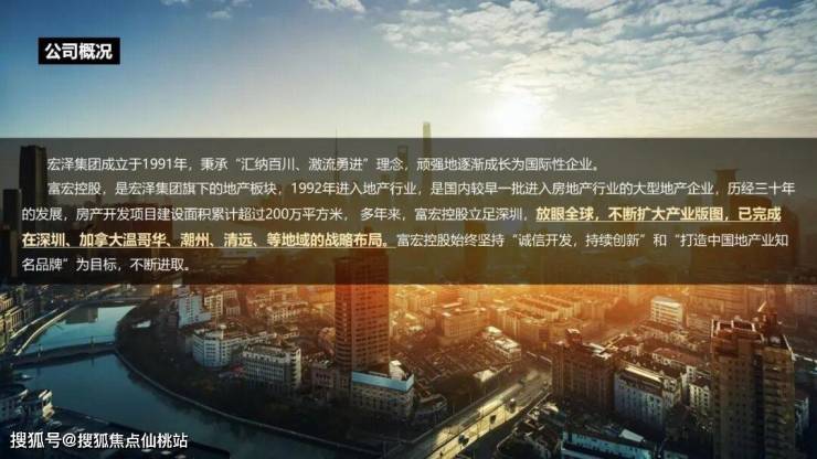 宏泽集团成立于1991年,秉承"汇纳百川、激流勇进"理念,已成长为国际化企业集团。旗下富宏控股自1992年进入地产行业,是国内较早一批房地产企业,累计开发面积超200万㎡,已完成在深圳、加拿大温哥华等地的战略布局。