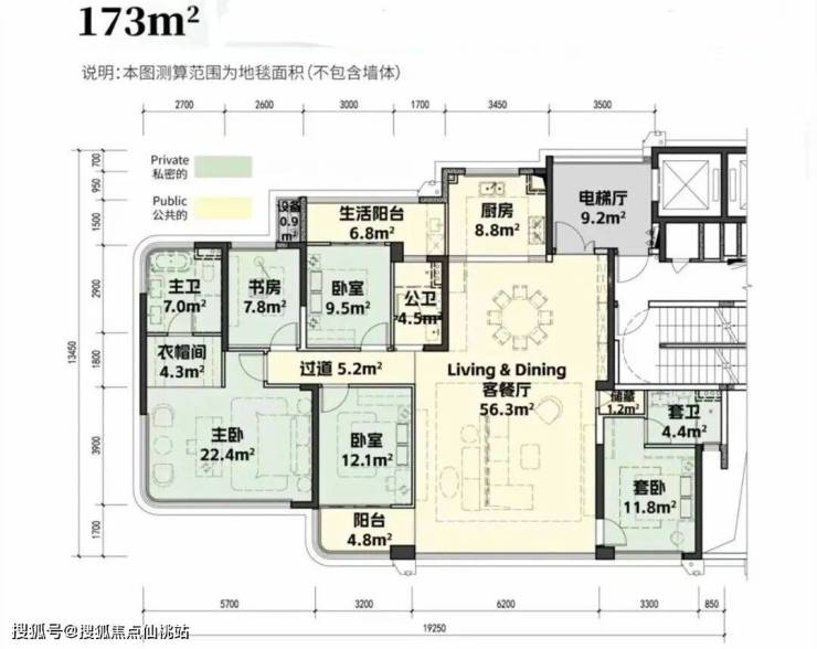 建面173㎡——五房两厅三卫,层高3.15米,套内面积187.7㎡,得房率约108.5%