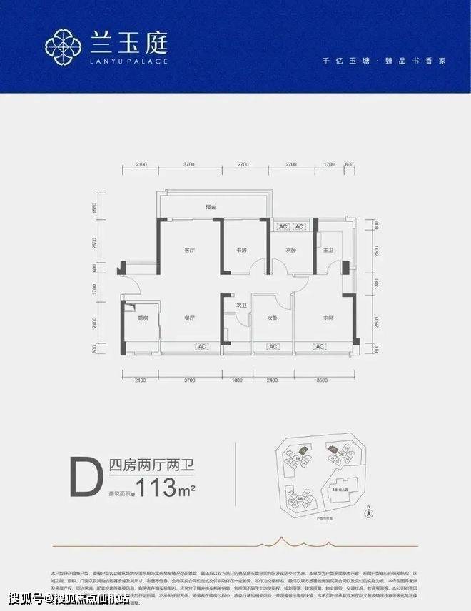 113㎡的4房2厅2卫,D户型,设计的是竖厅南北通透格局,客厅开间3.7米,4个卧室分别做到了3.5米/2.7米/2.7米/2.4米的宽度,客厅连接次卧出6.4米长的大阳台,U型厨房,公卫三段式分离,得房率约79%(不含赠送),阳台主朝西北或东北向。