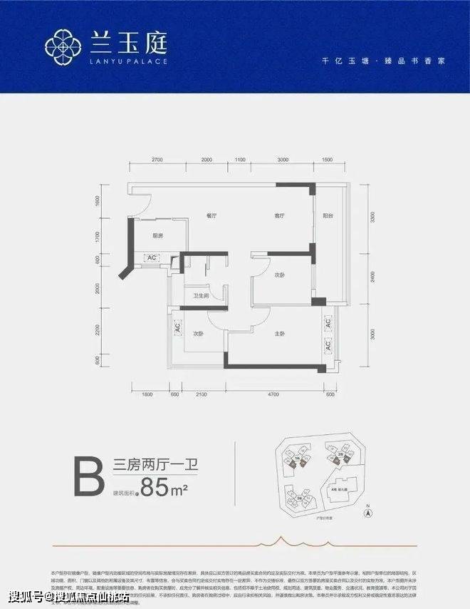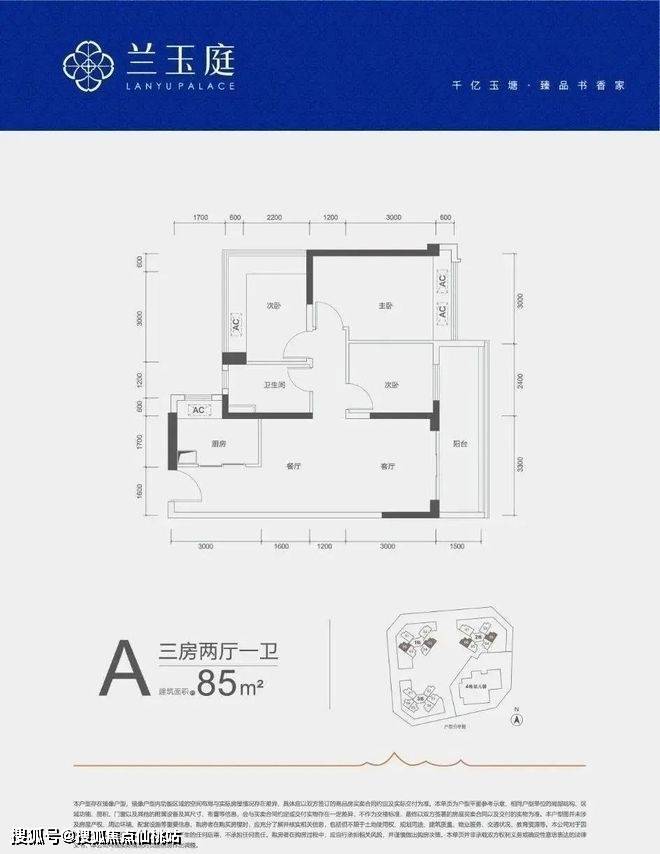 85㎡的3房2厅1卫,A户型,设计的是竖厅格局,客厅开间3.3米,LDKB一体化,三开间朝南,3个卧室分别做到了3米/2.8米/2.4米的宽度,客厅连接次卧出5.7米长的大阳台,L型厨房,得房率约79%(不含赠送),西南或东南朝向。