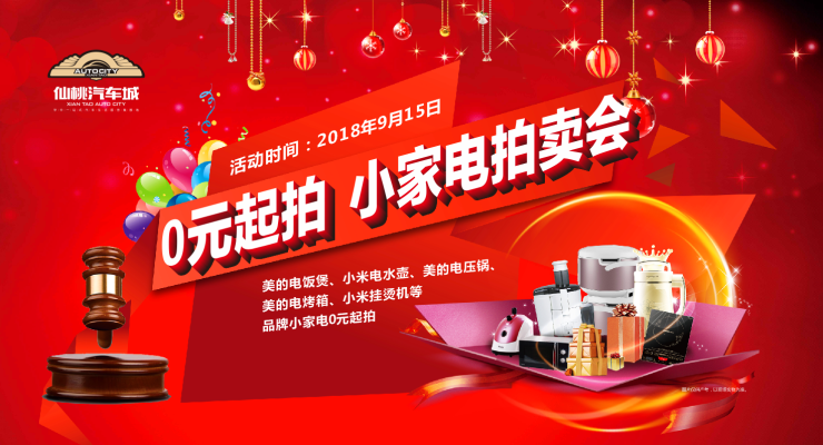 仙桃汽车城“0元起拍,小家电拍卖会”活动将于9月15日在项目售楼部开启,届时,现场所有拍品全部0元起拍!最终价格你们说了算。你没看错,美的电饭煲、小米电水壶、美的电压锅、美的电烤箱、小米挂烫机等品牌小家电统统0元起拍,能不能带走全看人品咯。超级罕见的机会,拍到手软才痛快!