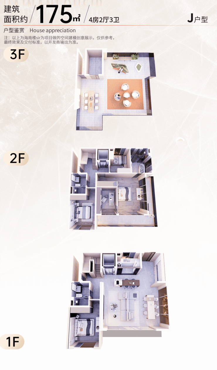 建面约175㎡的J户型,室内灵动空间+室外露台+前后院的使用面积最高超560㎡+(参考数据,以实际交付为准),都是你家的私享空间。