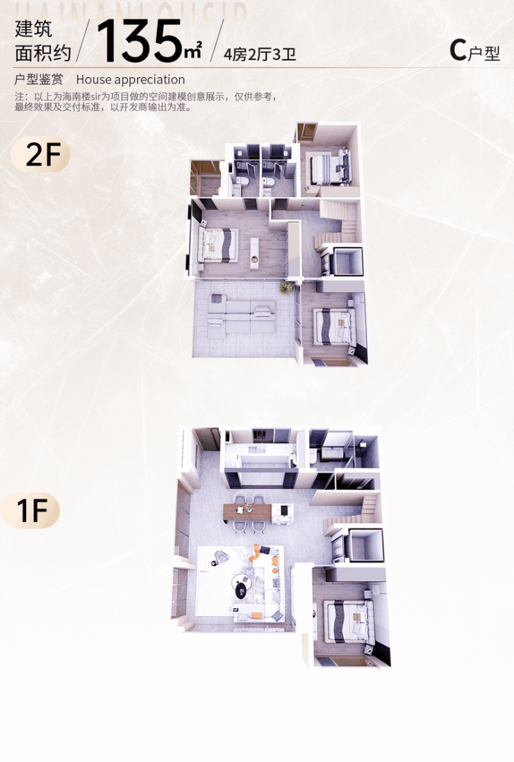 总建面约135㎡,有天有地有花园,只有你家私享,使用面积最高可达450㎡+(参考数据,以实际交付为准)。