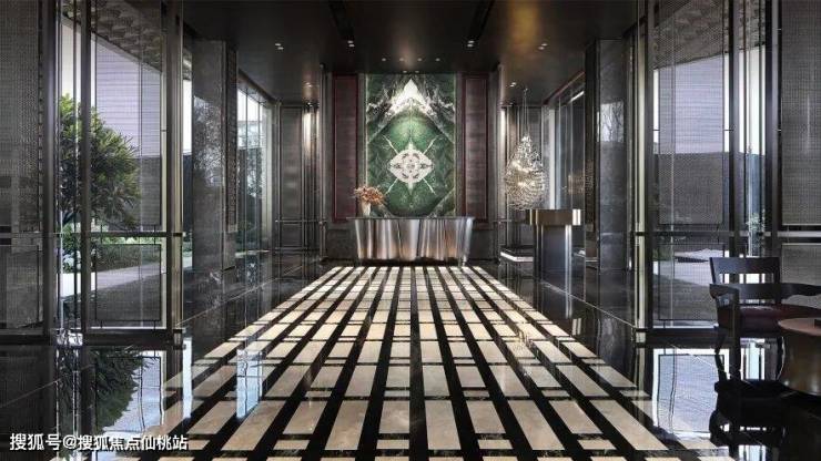 项目以纽约安缦酒店为灵感,结合岭南在地人文,打造颜值与功能兼具的沉浸式归家主场。近16米宽阔尺度的归家大堂门头,以钻石切面般的精致与通高玻璃幕墙交相辉映,更添归家的奢阔仪式。挑高约5米的归家大堂内,「人文之竹」大理石拼花地板,「百达翡翠」岩板景墙,以及闻水之石、桂语星辉艺术雕塑,令沉浸式度假体验在生活感与仪式感间自在流动。