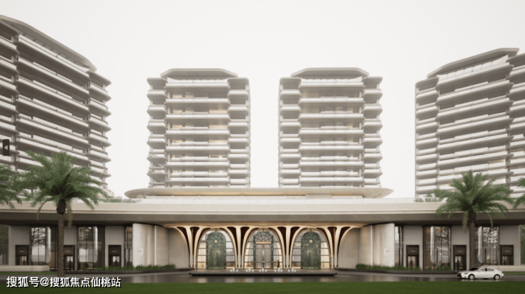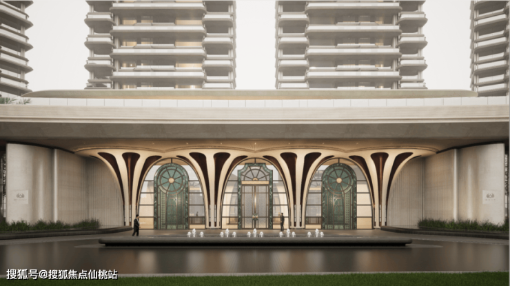 社区入口设计融合海洋元素的流体美学与几何美学,采用八根花柱造型;柱跨间为南洋风格艺术拼花彩玻,搭配奢石装饰门套、VI纹饰把手等细节,形成“八柱六门”入口空间;入口大门尺寸为12米高、90米宽。