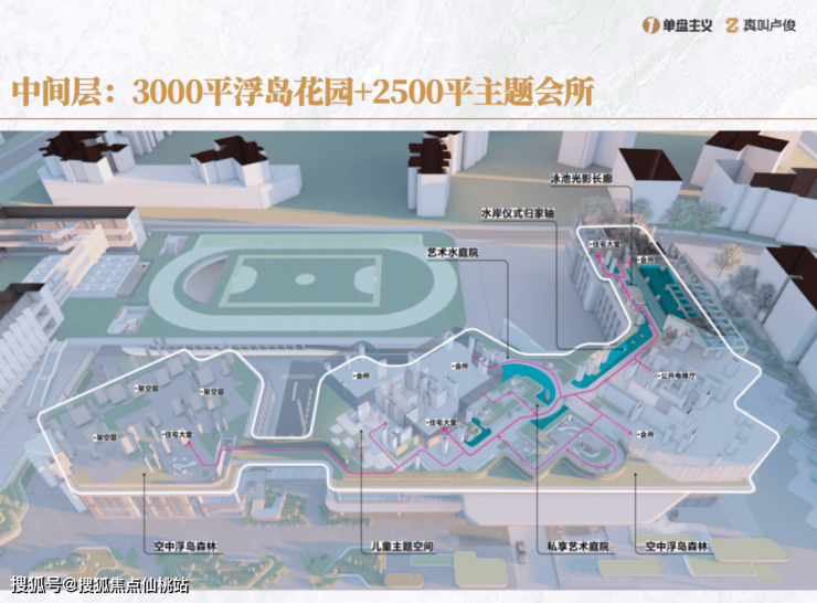 利用裙房屋顶打造拥有“仪式水轴“艺术庭院”“空中浮岛森林”三级景观设计的空中庭院,四栋住宅均漂浮于甲板之上,独享甲板庭院花园,以“海风吹拂下的豪宅底盘”托举城市上空的豪宅群落,形成立体景观系统。