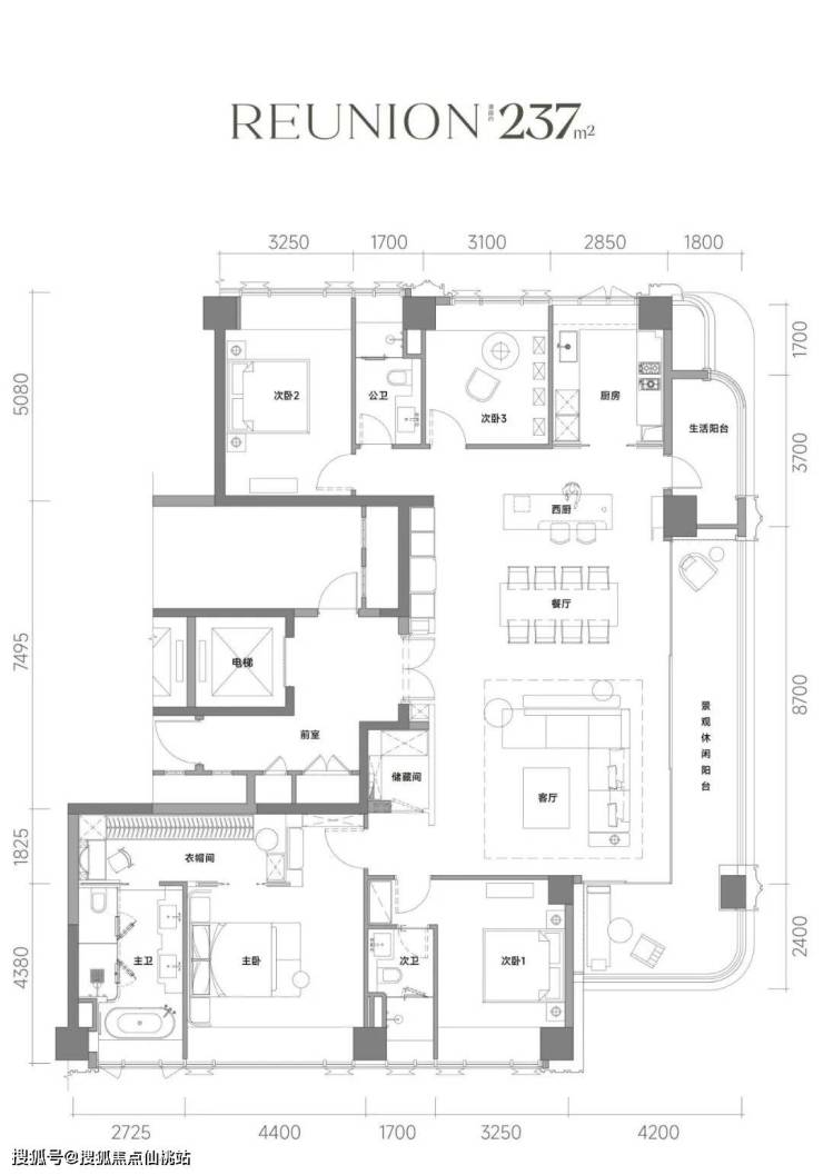最大的亮点是其面积高达60m²、接近标准羽毛球场大小的LDKB全景家庭厅,以及一个长约18.9米、面积约31m²的L型270°拐角瞰景阳台。