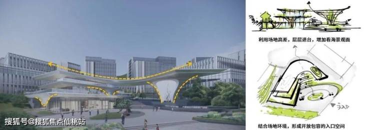 项目整体设计以“山海林石” 为概念,充分利用西高东低的场地高差,东侧临海界面融入“海岸礁石” 的设计理念,西侧靠山界面塑造波澜起伏的空间形态,整体上与背面山体形成丰富的空间变化,强化地域特色,打造由山向海阶梯式递减的空间格局;通过垂直生态,互联互通,模糊绿化边界,延展视觉通廊;引入碳吸收剂的“红树林”设计概念,仿生自然;融入海洋生物医药,海洋食品科技,智能制造等相关产业,塑造生物医药,智能制造产业高地,提供多元复合的新型产业生态环境,构建山-海-城-人-产共生共享的产业生物海岸。