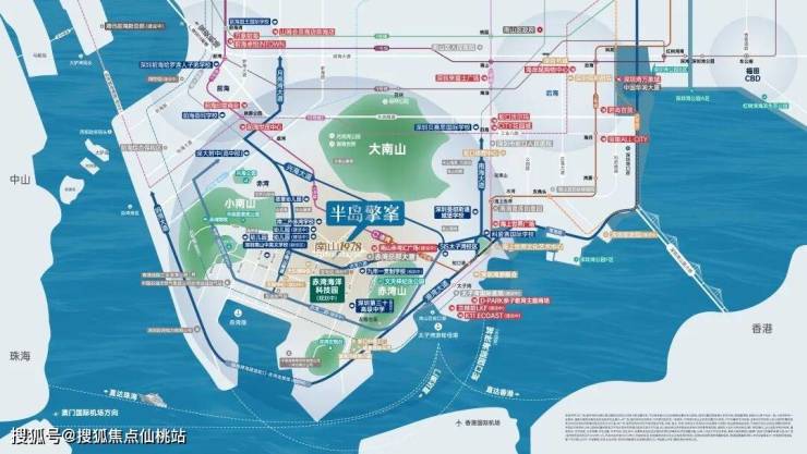 在大的蓝图下,中国南山以同步世界湾区的规划理念,打造“前港-中园-后城”的城市格局。并依托3山1海的资源禀赋优势,以“两环、三心、三轴、六大街区组团”的蓝图规划,打造屹立深圳湾区的世界半岛生活。