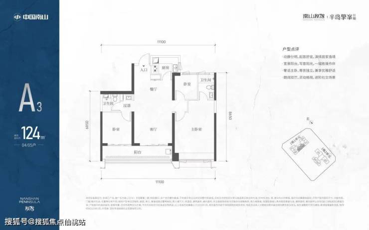 A3也是两条腿,分别是1-1栋04/05,主朝向是东南向,双龙抱珠格局。客厅拥有超大观景阳台,缺点是公卫是个暗卫,小次卧和主卫也对天井外走廊,采光不足。