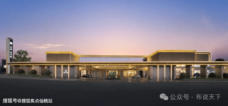 全盘采用新中式设计风格,长约75米、高约10.6米的超级门楼界面,由爱马仕石材+贵气仿古铜色金属立面打造而成。