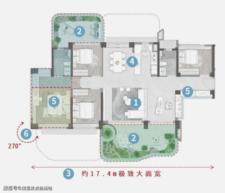 设计上,偶数层露台侧面拓宽1.25米形成约30㎡南向空中花园,进深约3.6米,奇数层则通过3.6米进深设计新增1.7㎡实用面积,露台连通客厅形成6米挑高视野。同时实现4开间朝南,南向面宽达12.4米,LDKG一体化形成约36㎡灵动社交方厅,极大增强了小户型的空间感与家庭互动性。