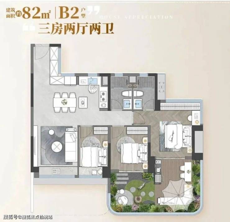 82㎡偶数层户型:同样是3房2卫,四开间朝南,南向面宽约12.4米。空中花园面积更大,有24㎡,实用率约131%,实用空间约110㎡。LDK一体化空间,开放式厨房设计,可打造有岛台,直连餐厅,约20㎡竖厅布局,亦可实现约34㎡L型超级大方厅灵活布局。