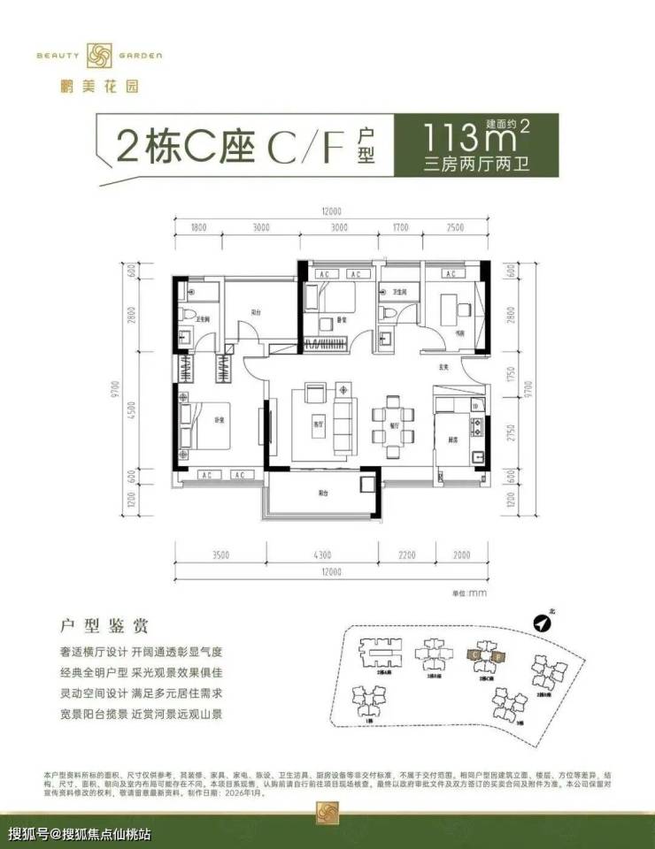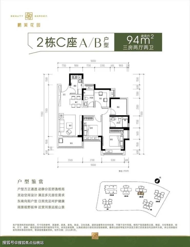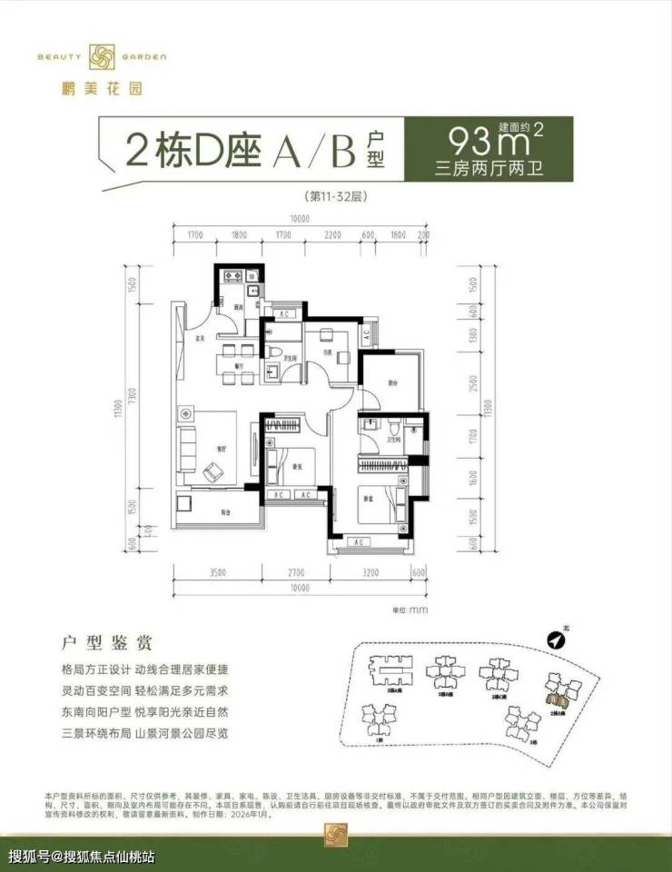 89㎡的3房2厅2卫,设计的是竖厅格局,得房率约92%(包含赠送),阳台约5.1㎡东北朝向看山景。