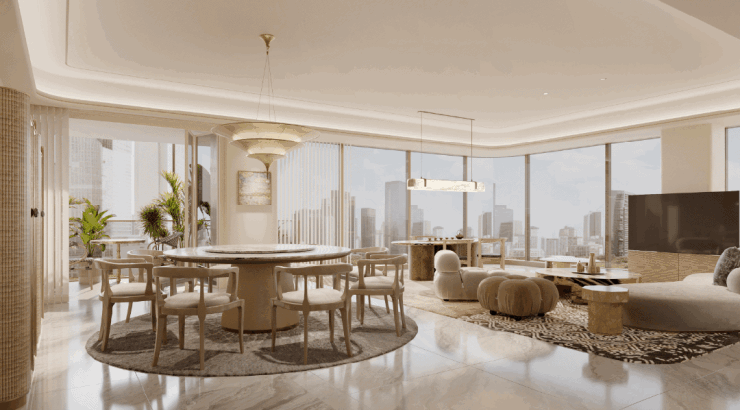最热门的建面约239㎡户型:以“空中平墅”为理念,配备独立电梯厅、入户花园、270°环幕采光,每户更配备了私人泳池。