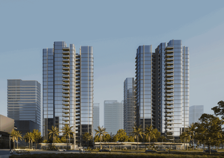 海贝波纹肌理的超白玻幕墙与铝板饰面相互融合,搭配流线型金属饰条和非标圆弧设计,建筑立面随着天光云影流动,呈现出如同钻石切面的立体光幕效果,形成独特的辨识度和尊贵身份象征。