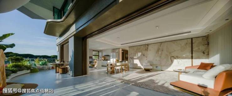 约3.1米室内层高,营造出“舒朗”与“通透”的体验感;室内无露柱露梁设计,缔造约70~170㎡LDKG一体化奢阔豪厅,联动餐客厅、厨房、阳台及庭院,打造兼具圈层社交宴会与家庭情感互动的自由场域。