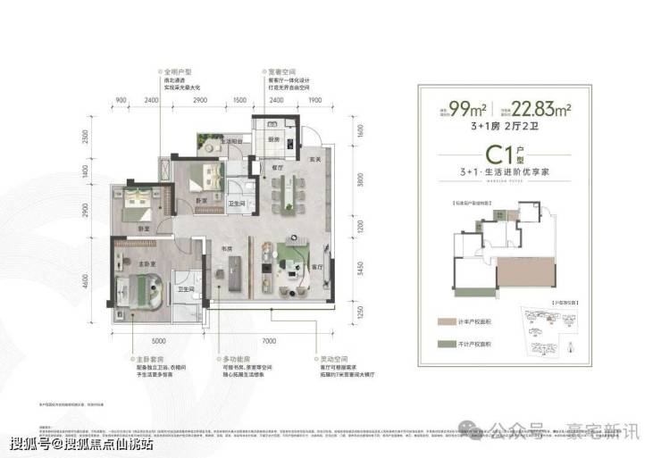 ▋明星户型:建筑面积约99㎡ 3+1房两厅两卫 可拓展面积22.83平米 得房率约106%