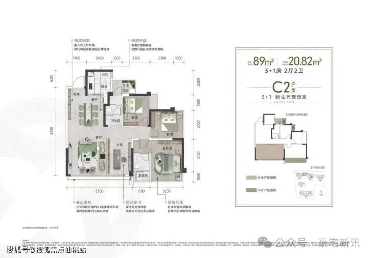 ▋爆款户型:建筑面积约89㎡ 3+1房两厅两卫 可拓展面积20.82平米 得房率约106%