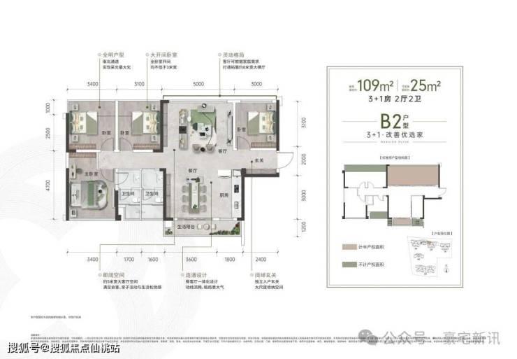 ▋王牌户型:建筑面积约109㎡ 3+1房两厅两卫 可拓展面积25平米 得房率约106%