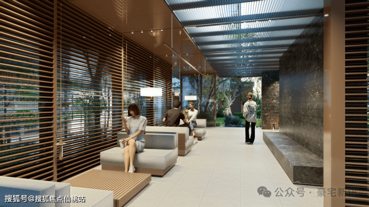 设置精致的酒店式花园会客厅,以自然为背景,打造一处静谧会客厅,附近还规划有会客水院和休闲花园等功能区,在特选朴树和周围在花境的烘托下,打造独有的专属私人休闲功能区。会客厅采用格栅围合而成的连廊,布置茶几、沙发,这里休息、会客、洽谈回归慢生活,享受友好和谐的社区氛围,增加邻里沟通交流。
