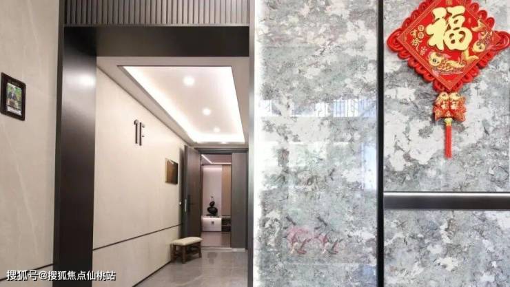 停好车走进地下单元入口,发光的楼栋标识让人一眼就能识别自家单元。深色不锈钢造型门框搭配仿天光灯幕、岩板背景和星空顶,还有精心摆放的植物景观,仪式感直接拉满。