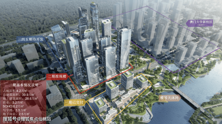 区位方面,项目位于横琴合作区核心位置,开新三道西侧、天沐河南侧,项目与即将动工建设的澳门大学横琴新校区仅一路之隔。