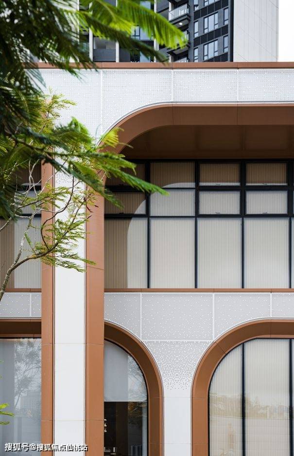 商业部分立面设计在灰白色主色调中融入香槟金元素,通过金属线条与玻璃幕墙的虚实对比,体现精工质感的同时,又营造出精致奢华的商业氛围。骑楼式檐廊延伸出流畅的曲线,搭配暖色灯光与艺术装置,既延续了传统街区的烟火气,又赋予空间现代时尚的都市感。