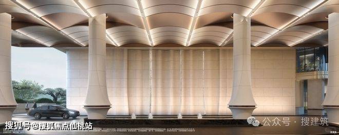 建筑立面从海风吹拂的波浪中汲取灵感,提炼出双反弧形立面元素,应用于阳台、檐口与窗线等设计,形成富有韵律的“海风百褶”肌理。玻璃幕墙搭配金属线条的构成和组合,既保证了室内采光与隔音效果,又在不同光线下呈现出灵动的光影变化,让建筑如同漂浮在城市上空的“流动艺术品”。