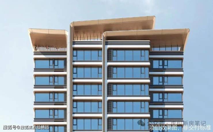 建筑外观:大面积玻璃搭配香槟金铝线条,流线型阳台线条,立面时尚现代