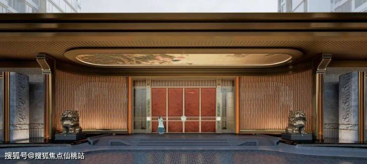 从踏入社区的第一步起,保利·宸央便以非凡气度铺陈归家路。约53米宸央门庭,取“五开间”官邸形制,门头以红金为主调,寓意“红袍加身,事业红火”。门楼造型取蝙蝠展翅之势,两侧全冠移植百万黑松,门前约2.4米高全铜“椒图”神兽静守。门内帝王华盖以双玻夹绢工艺复刻自宋徽宗《翎毛图》。超1100㎡的酒店式无风雨环岛落客区,让归家充满仪式感与从容,展现非同一般豪宅排面。
