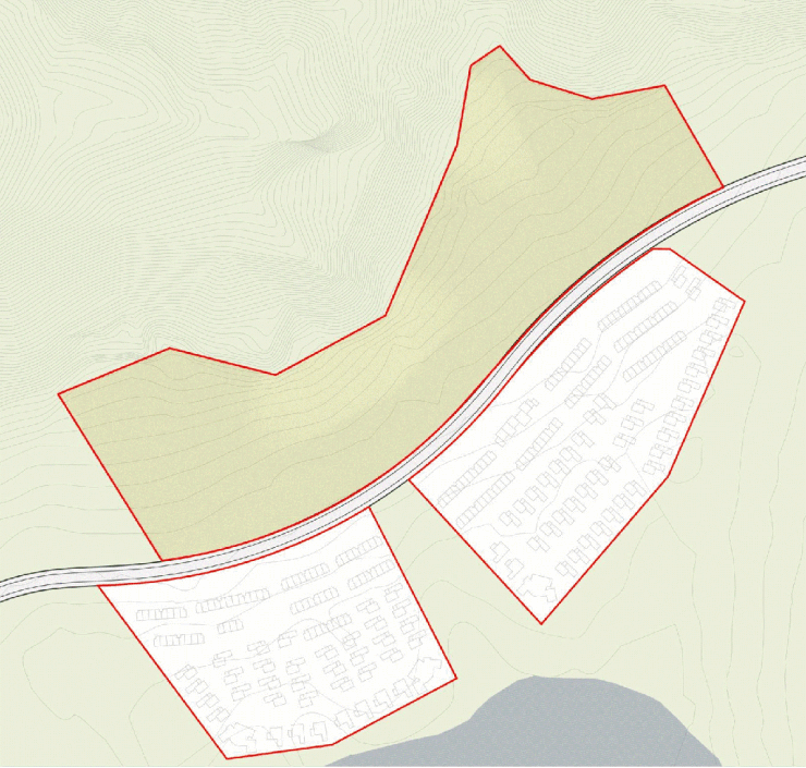基地所在三面青山围合,一泓库水衔于南境。我们择址库岸正对面,以中轴为引,牵湖山入园境。
