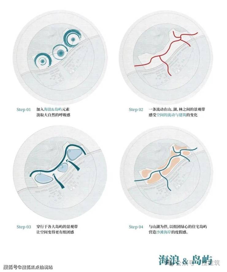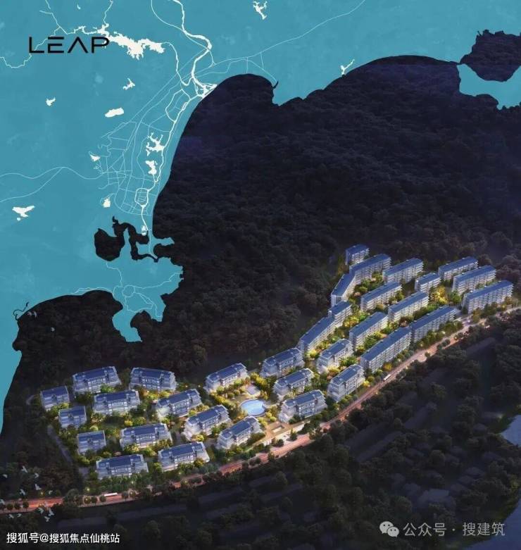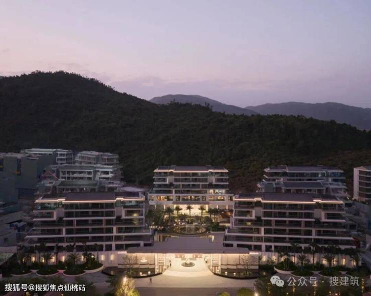 建筑布局沿用地不规则展开,高低错落,形成富有韵律的空间序列。这种布局方式不仅创造了连续通透的景观视线通廊,实现了“观山 - 赏湖 - 望海”的多层次视觉体验,还使建筑与地形紧密结合,让规划形态更为灵动,视线更为通透舒展,休闲度假感更为凸显,营造兼具松弛、活泼、静谧的场地气质。搜建筑