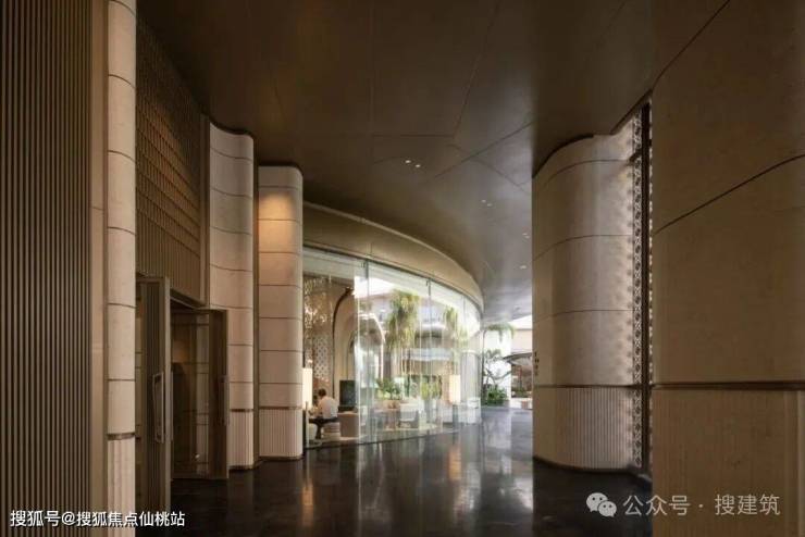 循二进院落动线行至礼序核心,圆形接待大堂如一颗凝萃度假意趣的璞玉,锚定园区空间的精神内核。搜建筑