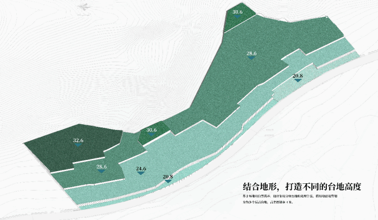 基于场地的自然高差,设计采用分级台地的处理手法,将用地依地势划分为多个标高台地,高差控制在4米。
