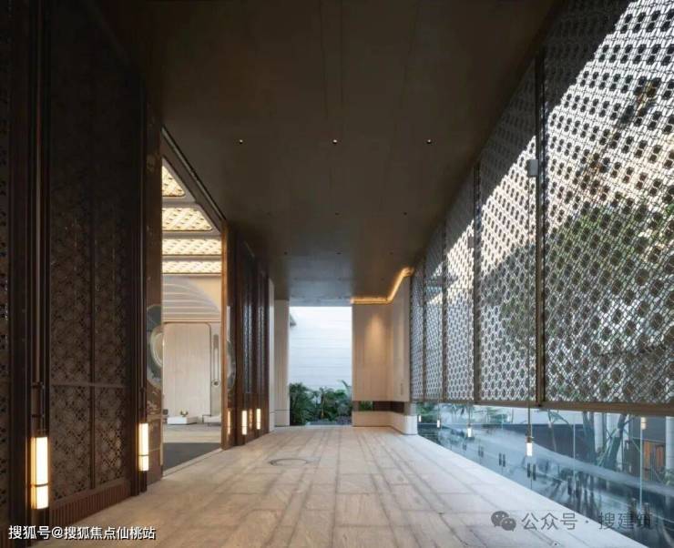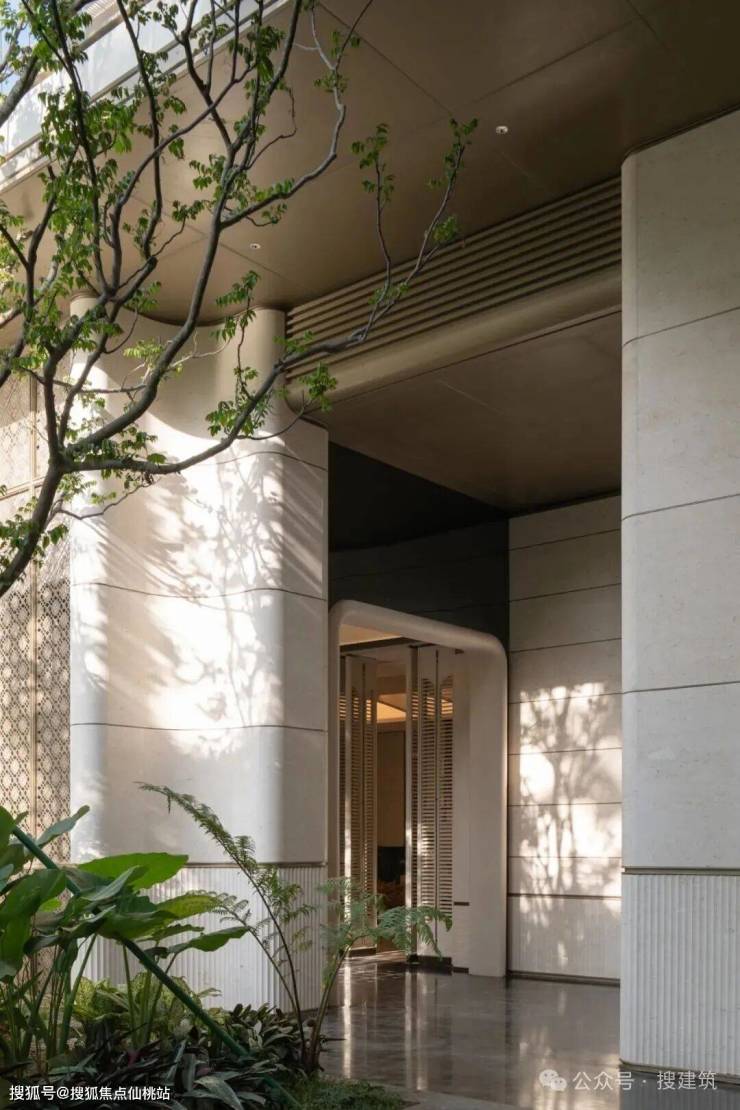 针对在地客群对尊贵归家礼序的偏好,主入口以铜制门柱为礼骨——凝敛沉穆的铜质肌理,暗合东方世家的厚重尊崇,每一道纹路里,都藏着对归家仪式感的郑重致意。搜建筑
