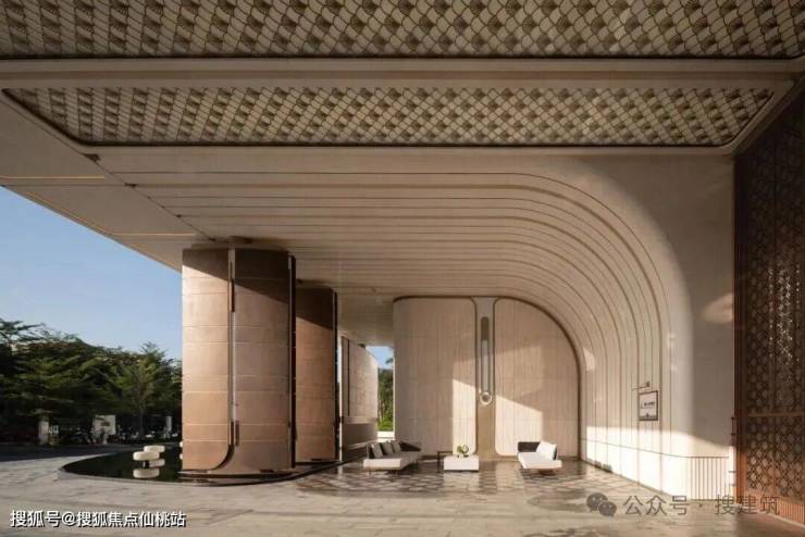 建筑细部营造上以滩贝为魂,将贝壳的原生灵韵揉入建筑肌理。甄选「贝金米黄」石材为幕:将沙粒的暖润、贝母的细闪凝于墙面,米白基底里流转着浅金光泽,既携来滨海滩岸的松弛灵动,又以石材的沉实质感,托举住宅应有的庄重气场。搜建筑