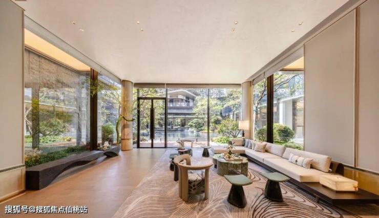 他们其实是把楼阁架在桥上,把桥架在瀑布上,让瀑布流淌在石阶步道旁,让步道一直贯穿到下沉式庭院的「一江春水」中。看到这样的场景,或许你会想起朱熹的「昨夜江边春水生,艨艟巨舰一毛轻。」朱熹的意思是说:选对了房子,你就会顺风顺水。