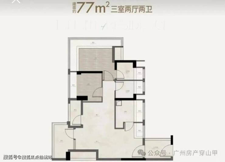77㎡三房两卫:带入户花园,四开间朝南,干湿分离双卫。