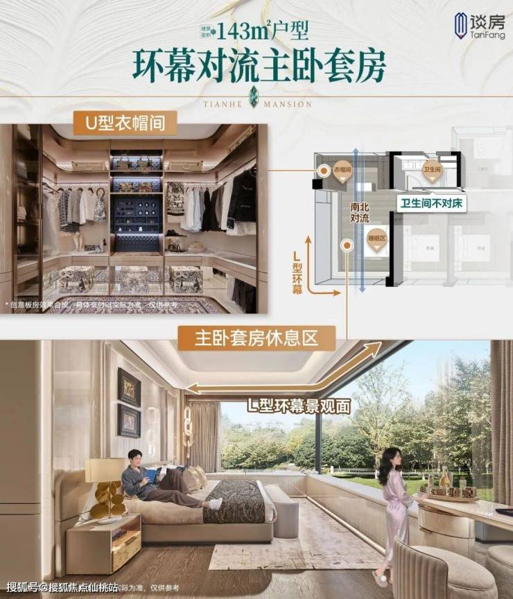 约30㎡U型环幕主套,更多一面采光和景观,充分收集窗外天光。在独立衣帽间放置收纳岛台,收纳清晰,取用方便,每天都在逛高定店。