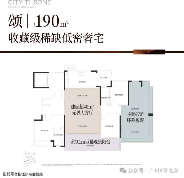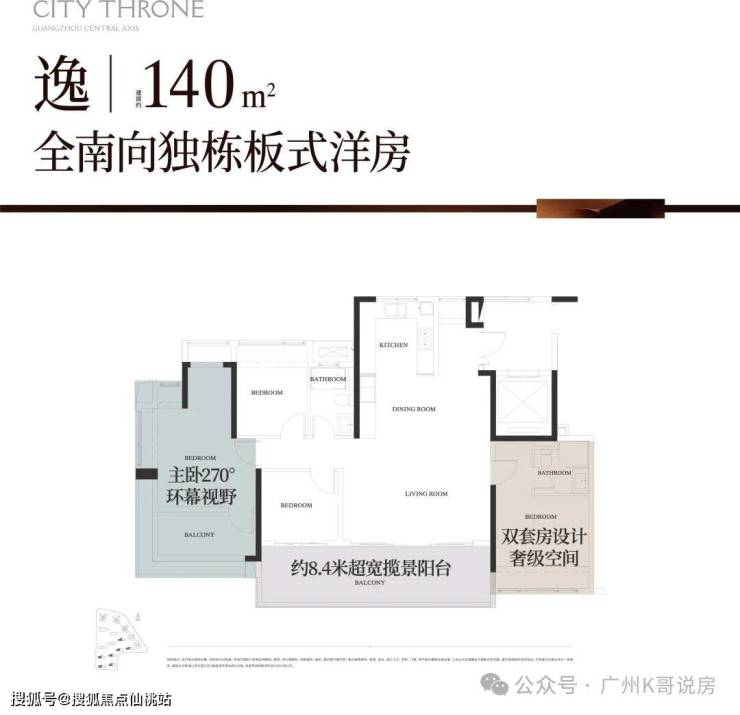 约8.4米南向巨幕阳台,主卧270°飘窗,能最大程度引园景入室。