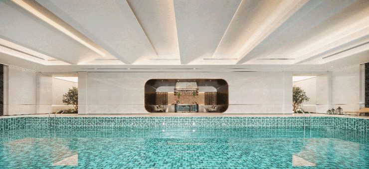 会所配置的阳光运动场、健身房、瑜伽室、室内恒温泳池、私宴厅五大场域,已提前运营,业主可手机预约享受。
