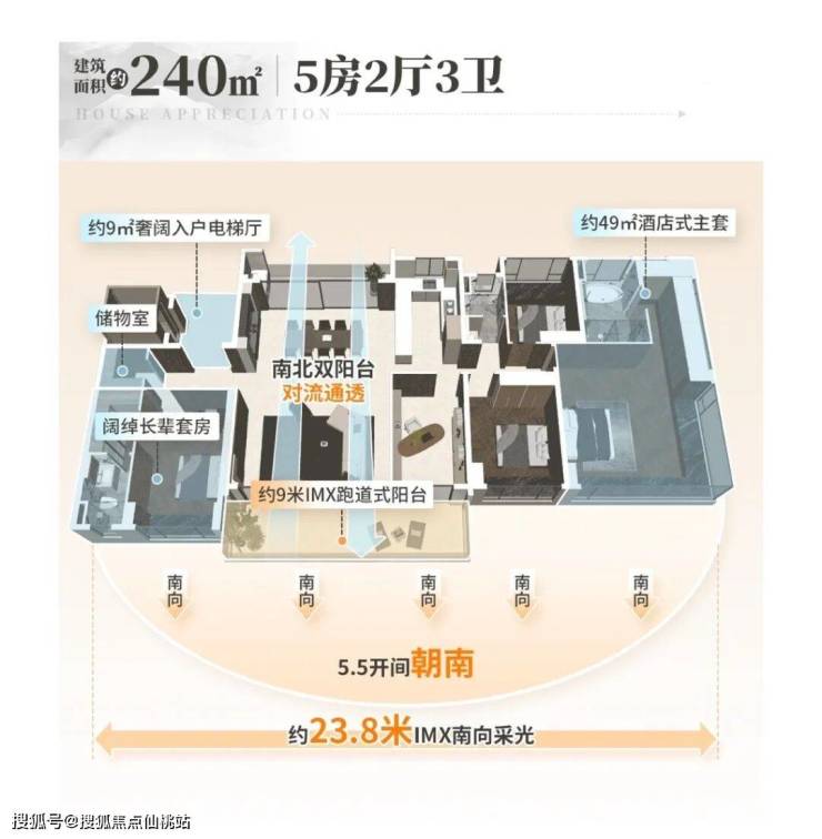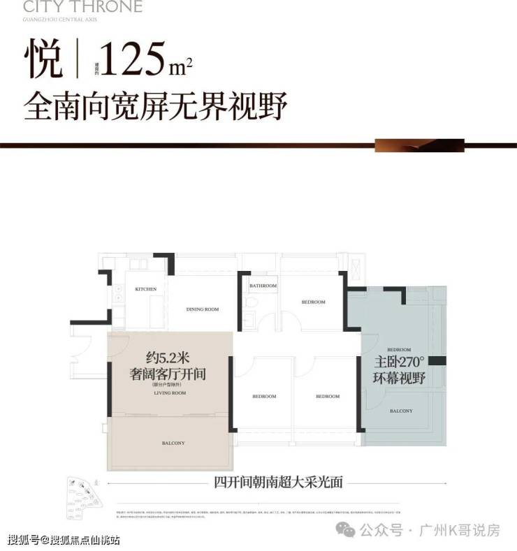 其三,270°飘窗+约8.4米南向巨幕阳台+双南向套房,户型很惊艳这个户型,四开间朝南,也是改善客户的首选。