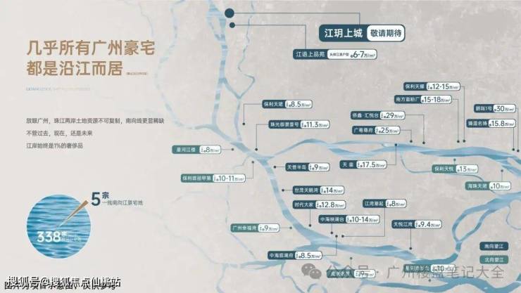 【占据1%稀缺资产】广州今年土地拍卖338宗地块,仅有1%是一线南向江景住宅,珠江两岸土地资源不可复制,南向线更显稀缺,江岸始终是1%的奢侈品。